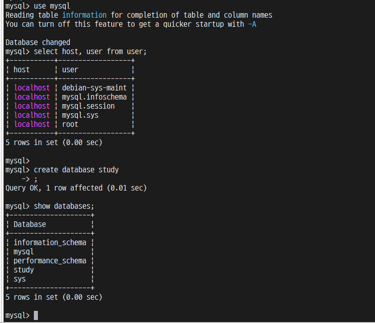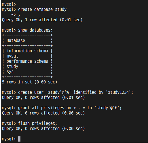 create database study; -- study라는 데이터베이스 생성 create user 'study'@'%' identified by '1234'; -- 계정은 study 비밀번호는 1234 grant all privileges on * . * to 'study'@'%'; -- study에 모든 권한 부여 flush privileges; -- 적용하기, 반드시해야함