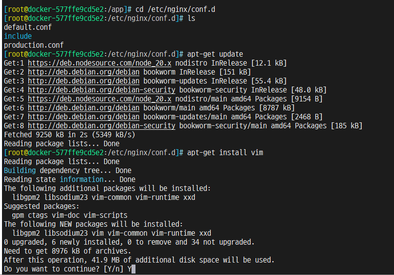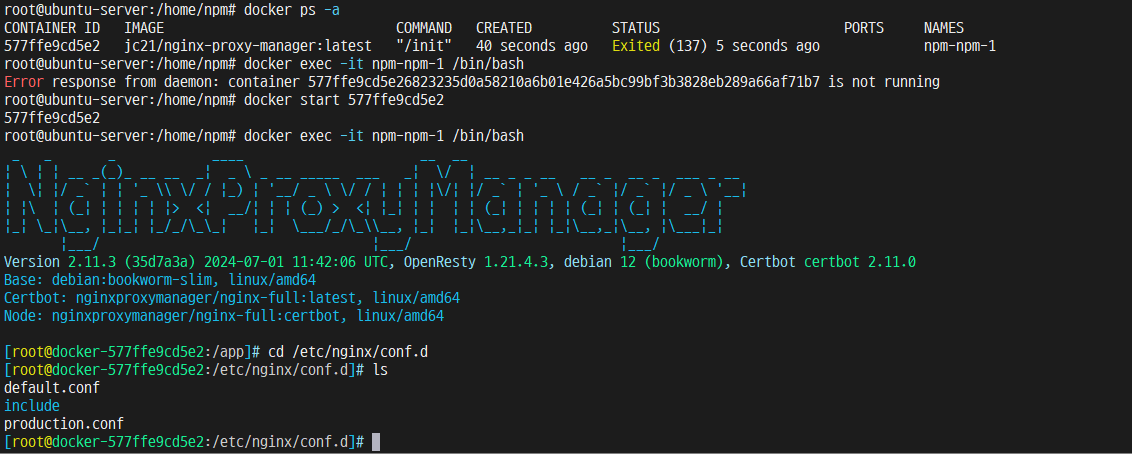 docker ps -adocker exec -it npm-npm-1 /bin/bash컨테이너 내부로 들어오고 nginx conf파일 디렉토리로 접근한다.
