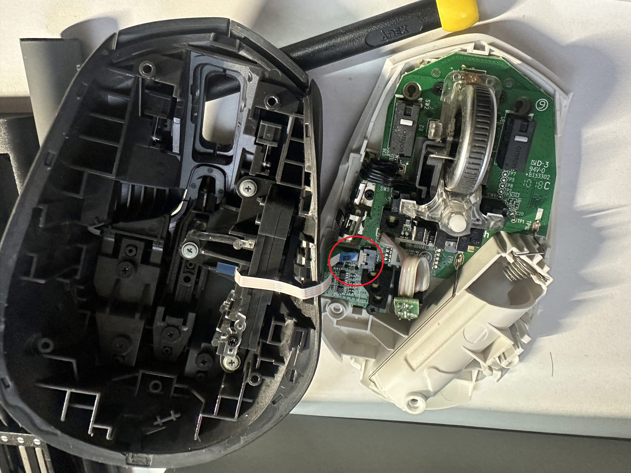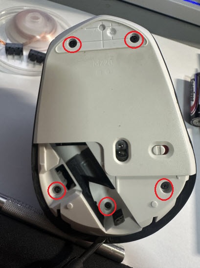분해를하려면 맨위 마우스 서퍼를 뗴어내야 숨어있는 나사를 풀 수있다. 재활용을 해야하니 조심히 뗴어낸다.