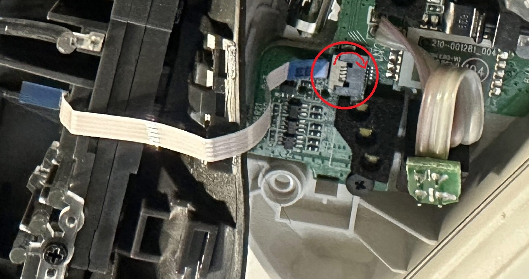 저 아주 작은 커넥터가 이빨로 케이블을 물고있다. 90도 위로 올리면 파란색부분의 케이블이 분리 된다.