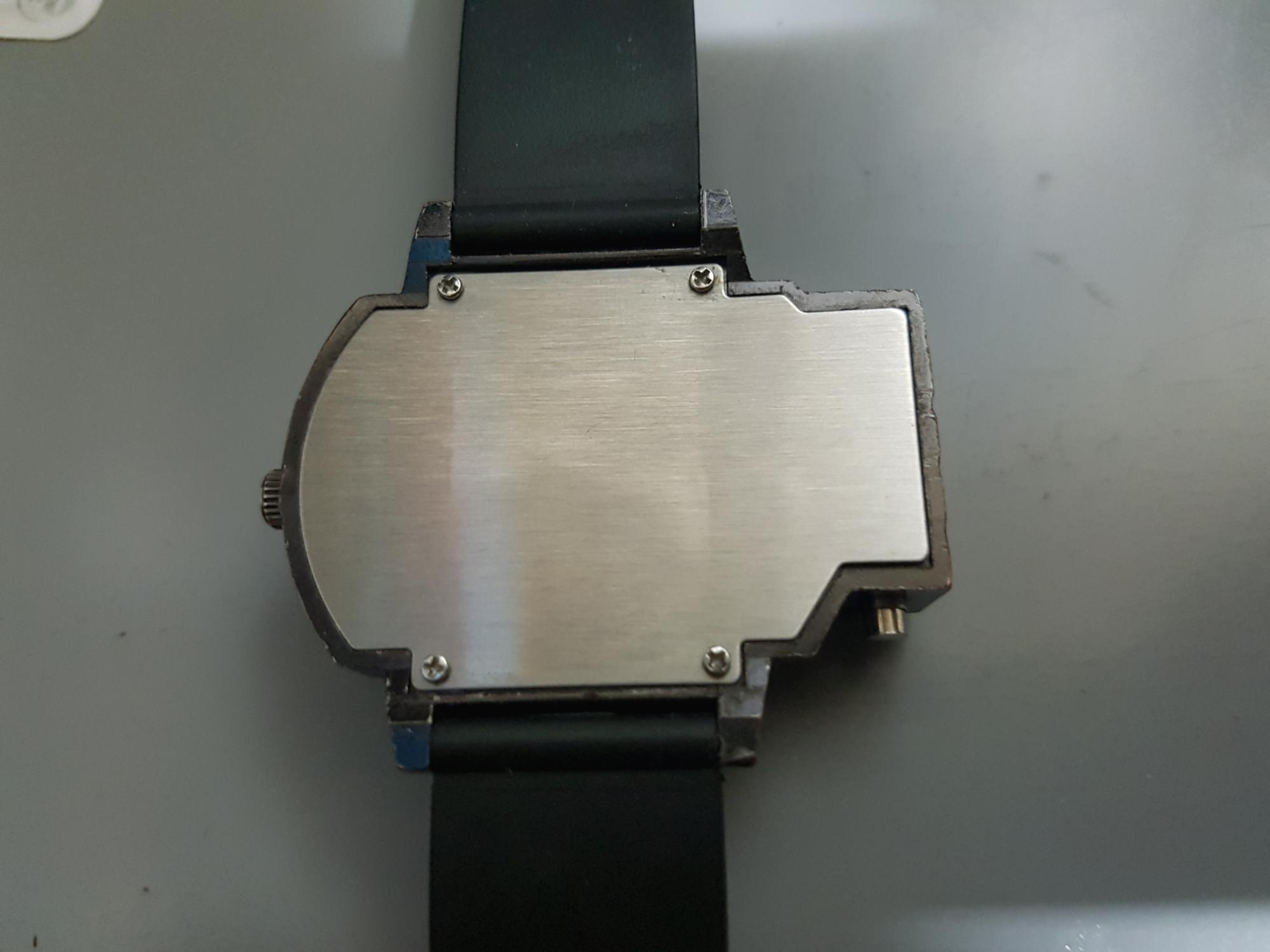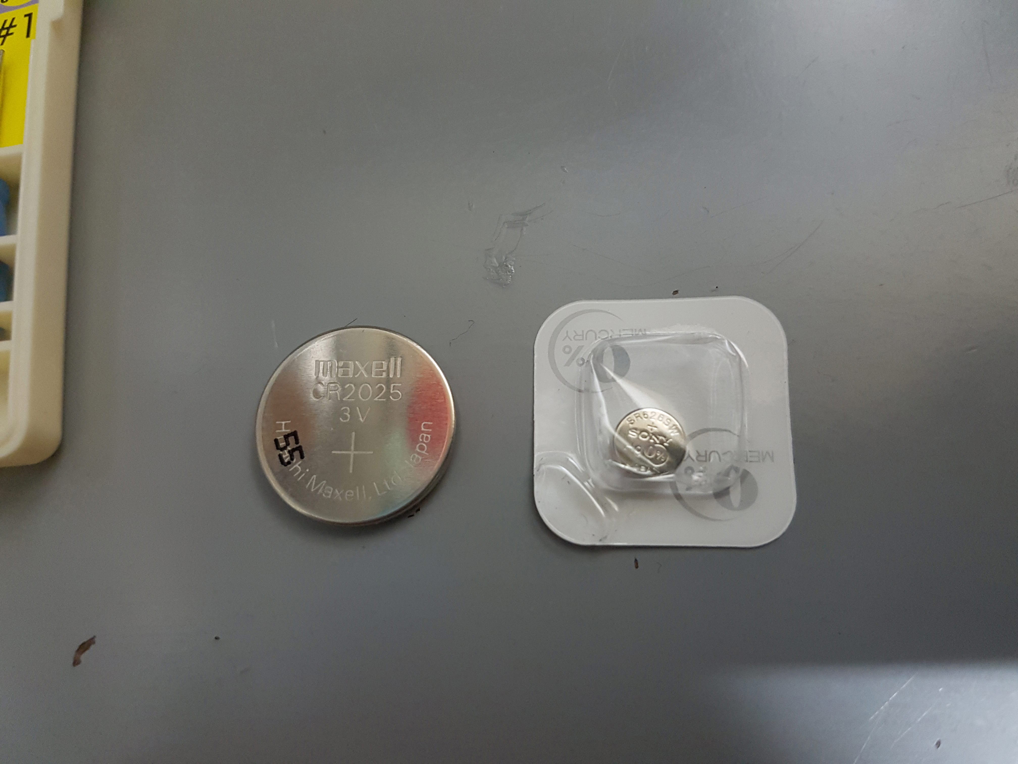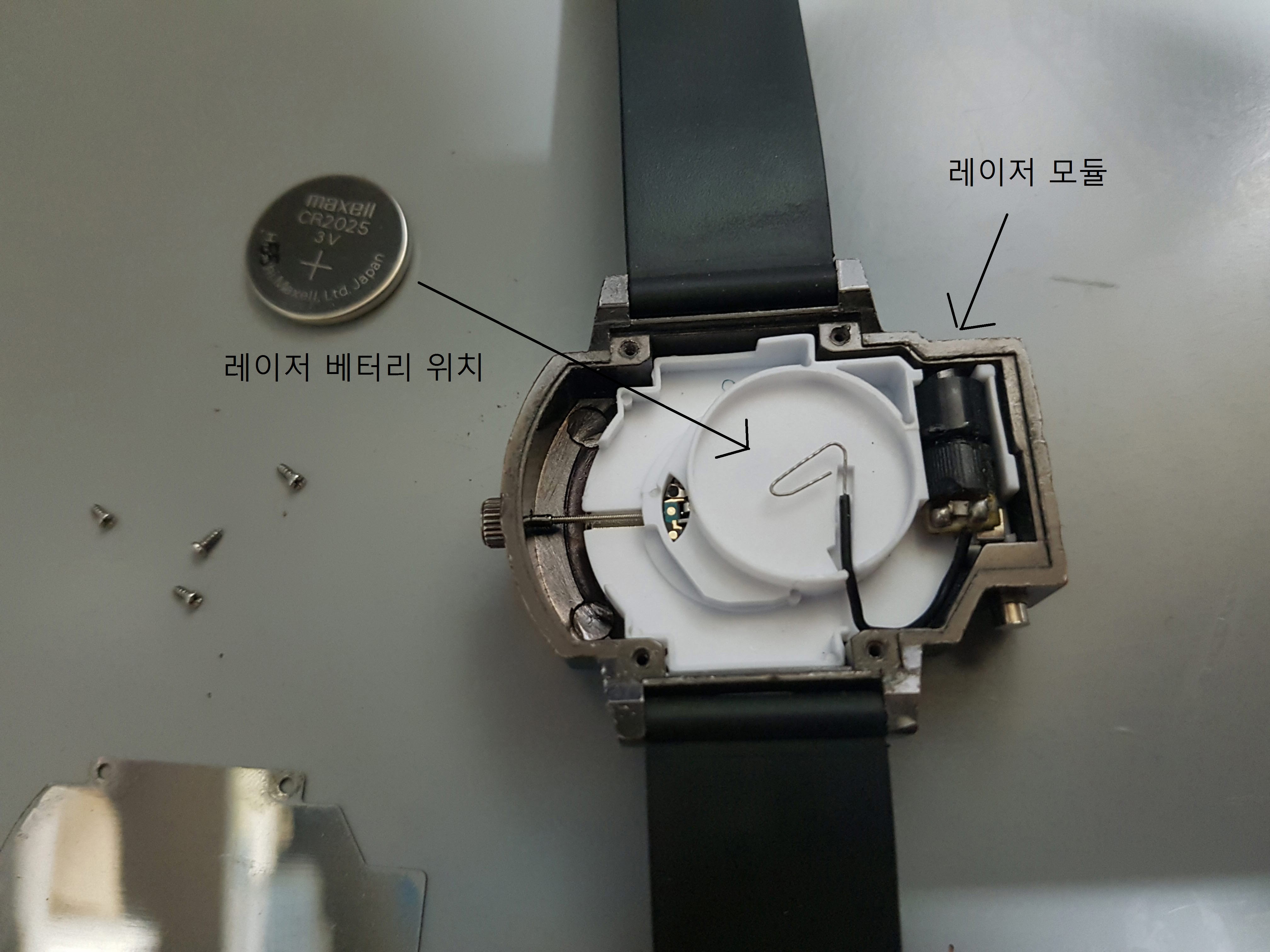 오른쪽 레이저용 건전지(CR2025) / 왼쪽 시계본체 건전지 (SR626SW) ※377A 라고도 불린다.