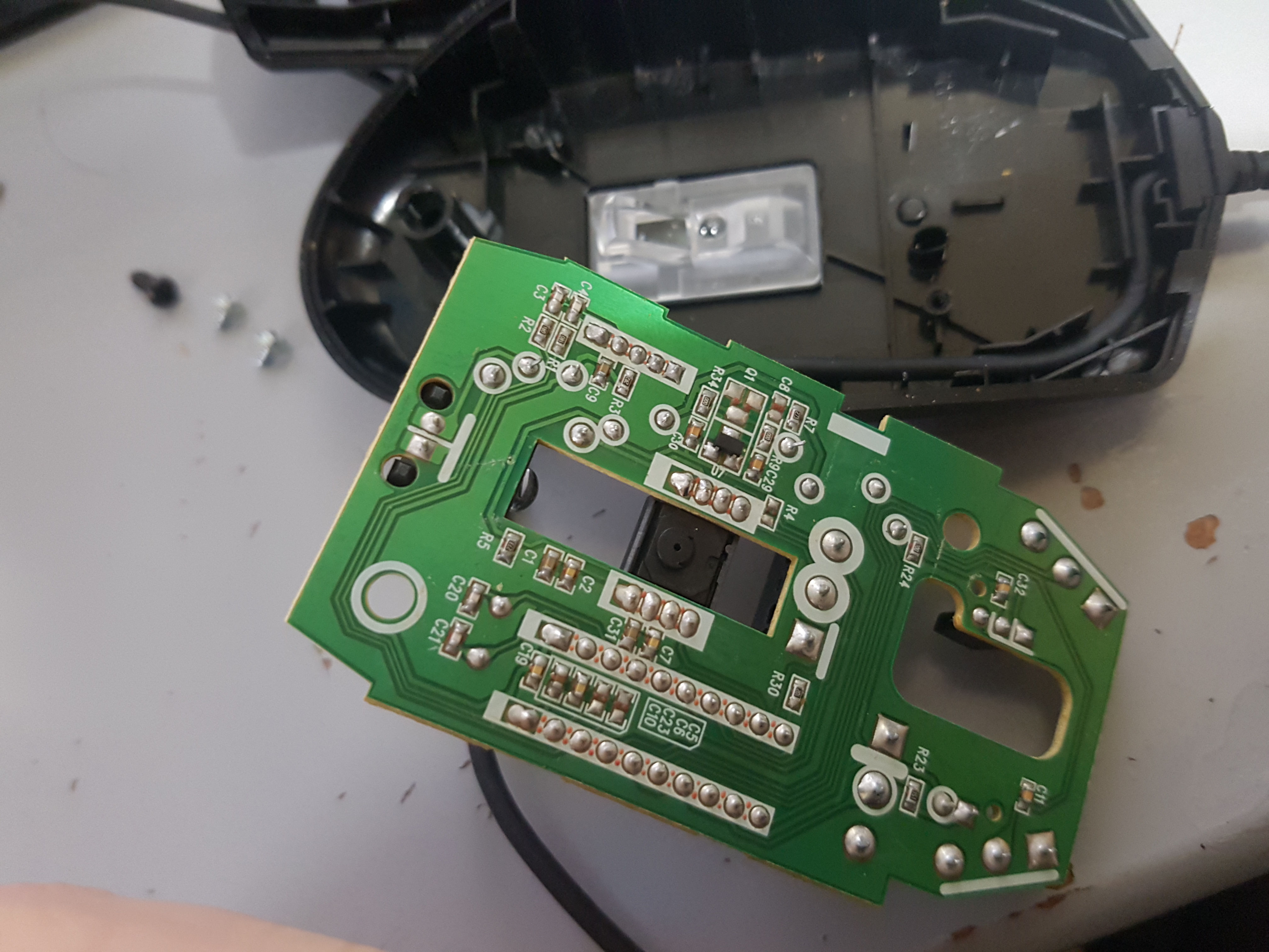 마우스의 스위치가 붙어 있는 기판이 보인다. 기판에 있는 나사도 제거한다.