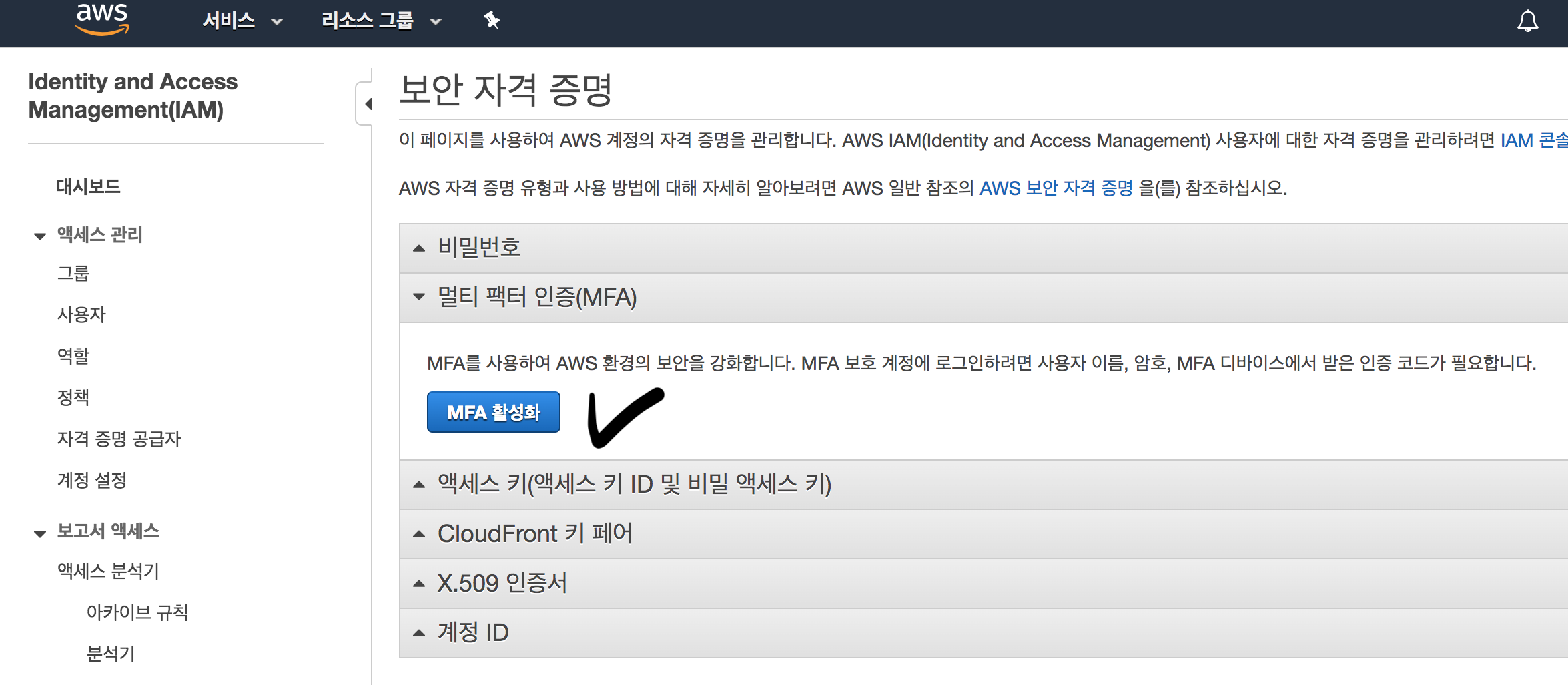 13. 이제 AWS 로그인할때(콘솔 로그인이라고도 함) 비밀번호 입력 후 구글 OTP숫자를 추가로 인증해야 로그인이 완료 된다.