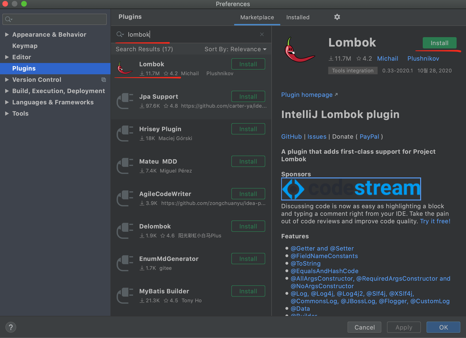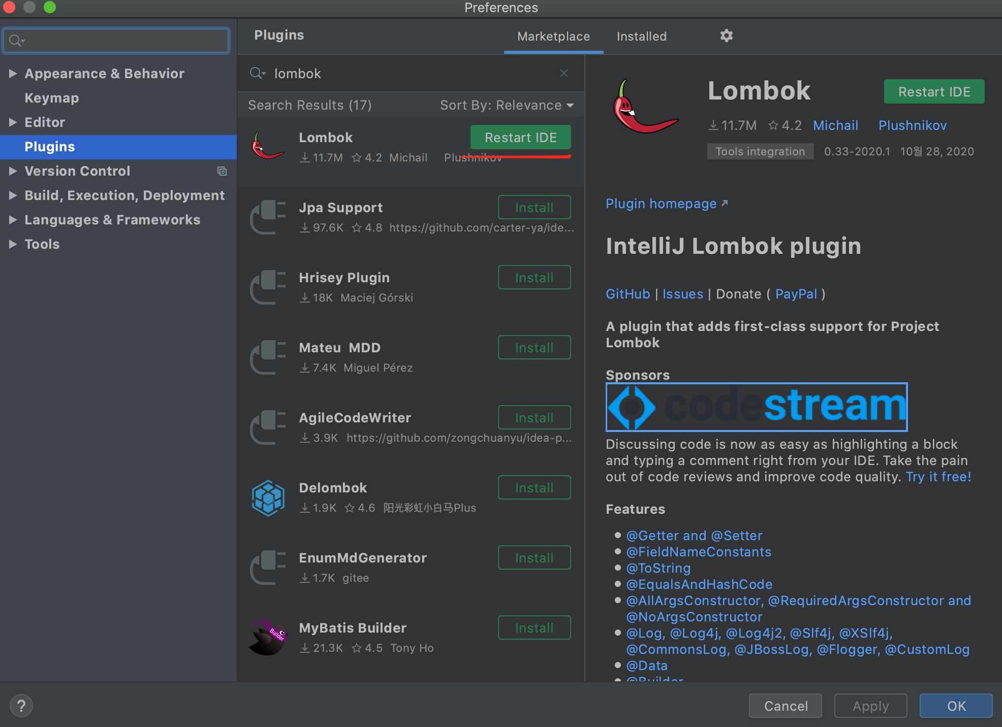 Preferences > plugins > MarketPlace 마켓에사 lombok을 검색하고 install하고 재시작 한다음에