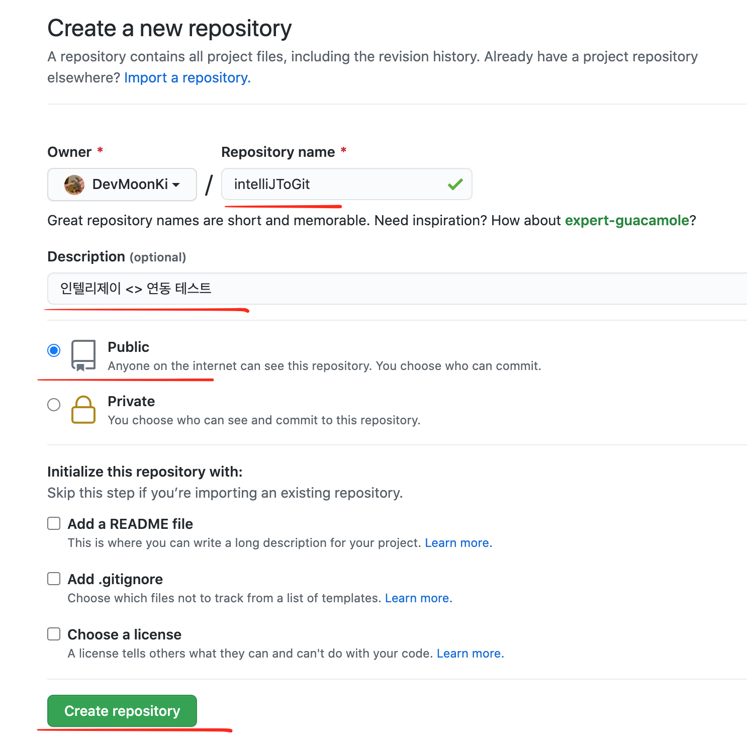 Initialize this repository with a README : 체크하면 자동으로 로컬 repository와 README.md 파일을 생성한다. IntelliJ 프로젝트 디렉토리를 local repository로 만들것이므로 체크하지 않는다.