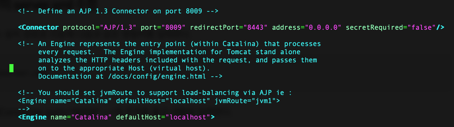 <Connector protocol="AJP/1.3" port="8009" redirectPort="8443" address="0.0.0.0" secretRequired="false"/>