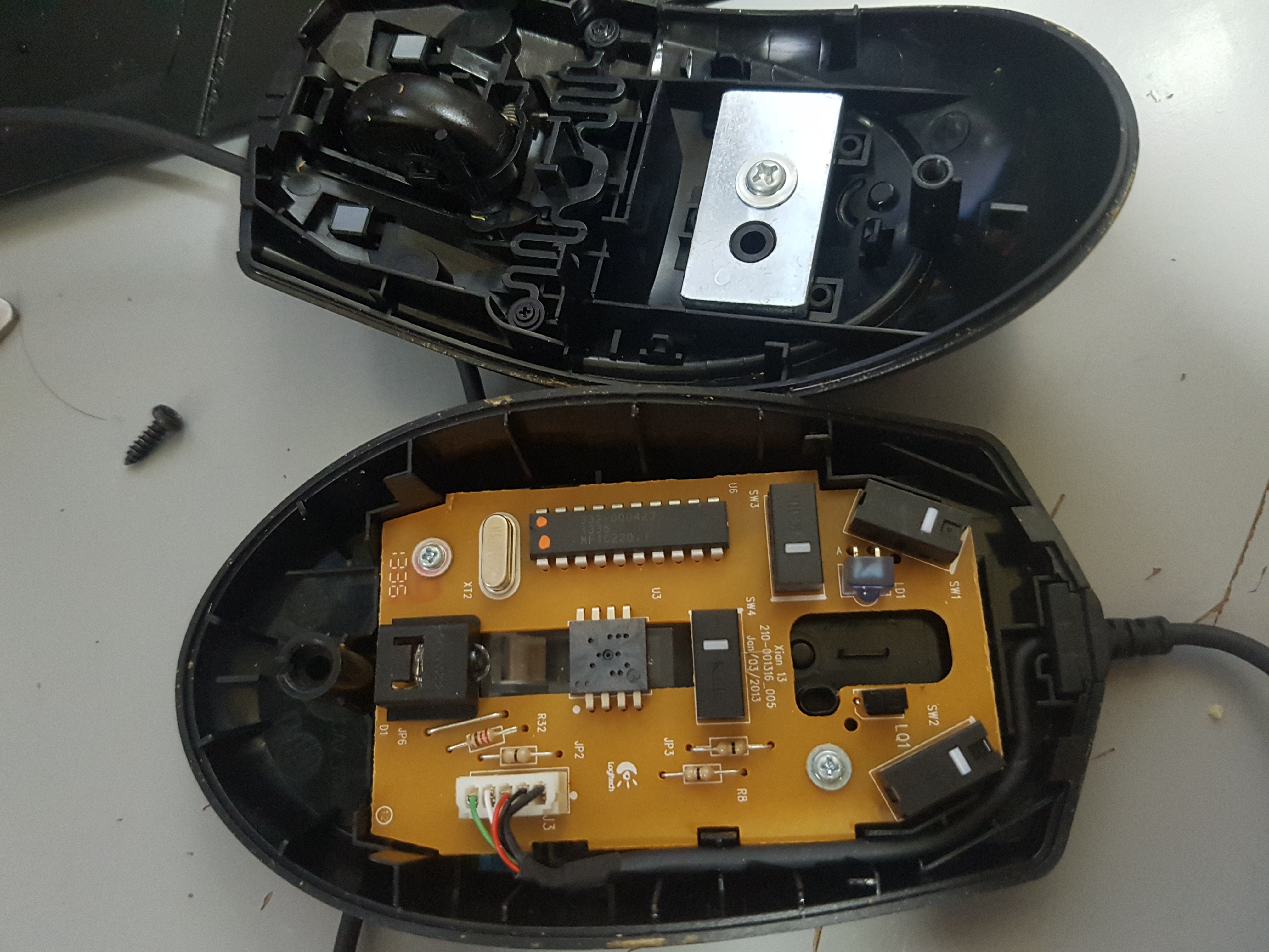 마우스의 스위치가 붙어 있는 기판이 보인다. 기판에 있는 나사도 제거한다.